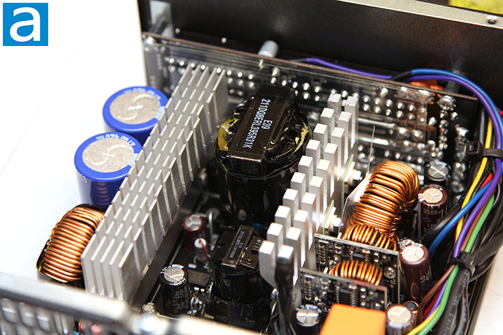 On the secondary side, we can see more Japanese brand capacitors from Nichicon and Chemi-Con rated at 105c. As with modern high efficiency power supplies, all rectifiers produce the +12V out -- while the +5V and +3.3V outputs are generated from the +12V output using a DC to DC converter within the power supply unit. An ANPEC APW7160A synchronous buck PWM controller can be spotted in this stage. Four Infineon IRFB3306PbF MOSFETs are responsible for generating the +12V output. The IRFB3306PbF's rated continuous drain current is 110A at 100c, and a pulsed drain current of 620A. It has a RDS(on) value of 0.0042 ohm maximum and 0.0033 ohm typical. Two Infineon BSC018NE2LS MOSFETs are responsible for generating the +5V and +3.3V outputs. The BSC018NE2LS's rated continuous drain current is 97A at 100c and a pulsed drain current of 400A. Drain source voltage is rated at 26V, and a RDS(on) value of 0.0023 ohm maximum and 0.0018 ohm typical. Meanwhile, a Silicon Touch PS223 monitoring IC provides over/under current and over/under voltage protection. The datasheets for all components mentioned in this review can be found on their respective manufacturer's websites.