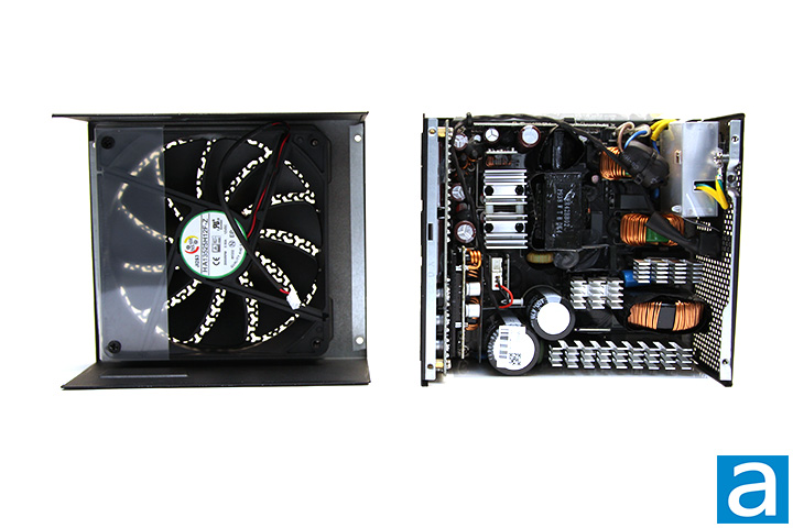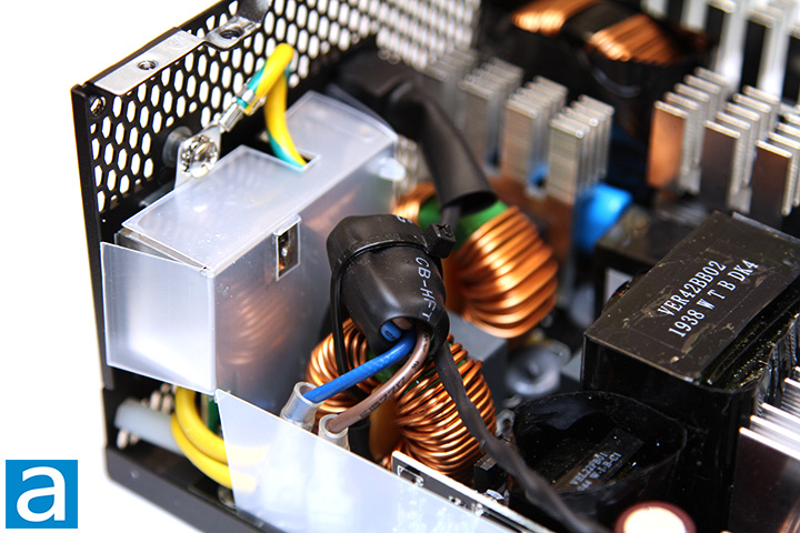 On the secondary side, we can see more Japanese brand capacitors from United Chemi-Con and Rubycon rated at 105c. As with modern high efficiency power supplies, all rectifiers produce the +12V out, while the +5V and +3.3V outputs are generated from the +12V output using a DC-to-DC converter within the power supply unit. An ANPEC APW7159 synchronous buck PWM controller can be spotted in this stage. Four Fairchild Semiconductor FDMS015N04B MOSFETs are responsible for generating the +12V output. The FDMS015N04B's rated continuous drain current is 100A at 100c and a pulsed drain current of 400A. Drain source voltage is rated at 40V, and an RDS(on) value of 0.0015 ohm maximum and 0.00113 ohm typical. Six Infineon BSC0906NS MOSFETs are responsible for generating the +5V and +3.3V outputs. The BSC0906NS's rated continuous drain current is 40A at 100c and a pulsed drain current of 252A. Drain source voltage is rated at 30V and an RDS(on) value of 0.0045 ohm maximum and 0.0038 ohm typical. Meanwhile, a Weltrend WT7527V IC provides over/under current and over/under voltage protection. The datasheets for all components mentioned in this review can be found on their respective manufacturer's websites.
