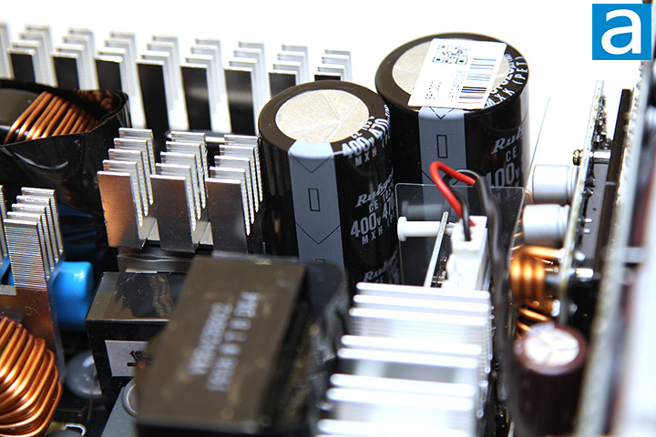 On the primary side, we can see two Japanese brand Rubycon capacitors. Japanese brand capacitors are usually what we expect from something in this price range, so this is nothing surprising. Our 100W version of Antec's Signature Platinum series incorporates one 820µF x 400V capacitor and one 470µF x 400V capacitor in parallel for an equivalent capacitance of 1290µF. Both of them are rated at 105c; whereas more value oriented power supplies usually use 85c rated capacitors.