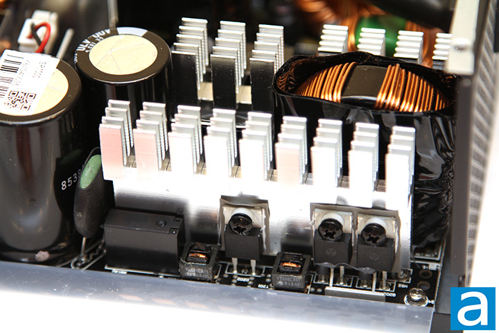 Disassembling the Antec Signature Platinum 1000W is quite straightforward with the removal of four screws. Its OEM is Seasonic, which is one of the best manufacturers of power supplies in the world. This power supply is based off the PRIME platform, which we have reviewed two models in the past, including the Seasonic PRIME Ultra Titanium 850W and Seasonic PRIME Titanium 850W. Our photo above shows an overhead view of the its internal components. At first glance, the build quality appears to be excellent, as one would expect from the company. One unique feature of the PRIME platform is that there are no power cables inside. The rear panel daughterboard is connected to the main PCB by a copper plate to reduce electrical losses and improve output quality. There are four heatsinks inside the power supply with all of them finned at the top. They are of various sizes, as you can see in our photo above.
