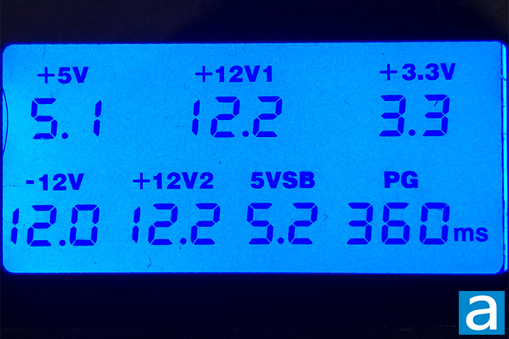 Voltages with minimal load are generally accurate, which is a basic requirement of power supplies out of the box. In this situation all are within 2%. The PG (Power Good) delay seems to be well within its rated range and general power supply standard of 360ms.