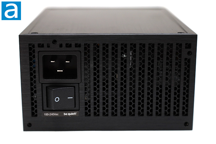 Starting from the back part of the power supply, we have the same familiar honeycomb mesh design as most PSUs with a bottom mounted fan, but with additional vertical bars in front of the honeycomb mesh grille. What you will find here is a horizontally aligned C20 connector for power input on the western edge along with an on/off switch next to it. The C20 plug is used to ensure a high current certified power cable is used. The included AC power cable is a fat 14 AWG unit, but unless you have a stack of these kicking around, be sure not to lose it. Under them is a sticker with be quiet!'s logo and the input voltage range.