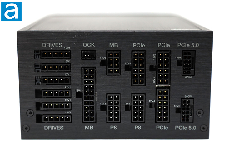 The rear cable connection panel is done nicely. be quiet! has also made the labels right side up in standard orientation. Similar connectors are grouped together and are laid out in a very logical manner. To ensure you know what is going on, they are all grouped and clearly labeled for minimal ambiguity. The +12V rail the connectors draw from is also stated. Starting from the top and left side of our photo, we have six peripheral headers for Molex and SATA, OCK pins, motherboard 24-pin split into two blocks close to each other, two ATX/EPS 4+4 pin outputs, three PCI Express connectors, and two 16-pin 600W 12VHPWR PCIe 5.0. Note the maximum power output for the two 12VHPWR connectors combined is 800W. Incompatible outputs will not physically fit into each other, so be quiet! has done a great job in this regard. This is a reasonable array of outputs in correspondence number of connectors on each modular cable, which should be sufficient for casual users and power enthusiasts alike.