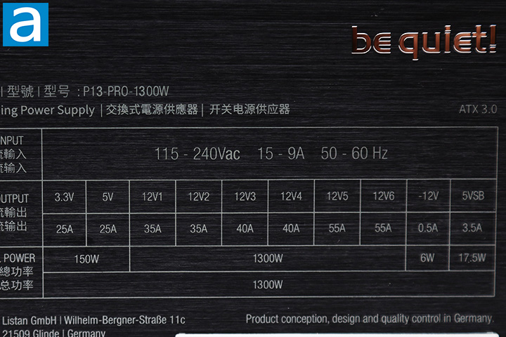 Overall, the combined power output for the whole be quiet! Dark Power Pro 13 1300W is 1300W, as its name suggests. It does sound a bit confusing to understand how this works at first, but generally speaking, this configuration is reasonable and should be sufficient to accommodate most users. The power outputs in the +3.3V and 5V rails are appropriate for its wattage class. You typically do not need more than 22A, because modern systems do not have a lot of need in this area.