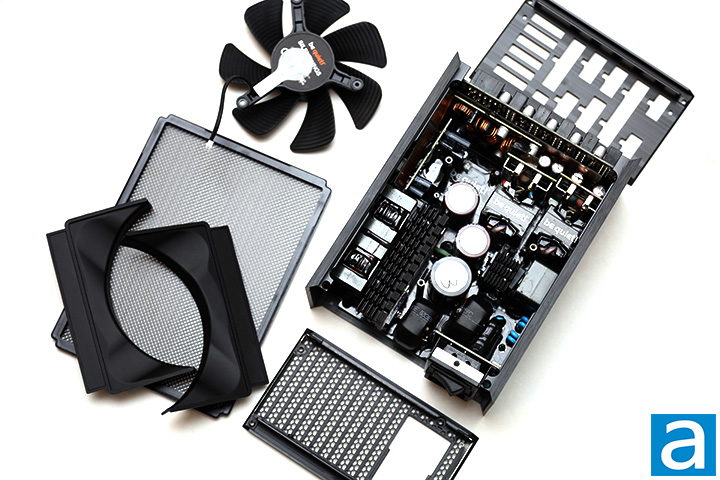Pulling the enclosure apart, I had to remove the fan frame halves and impeller separately to get to the internal inspection. The fan frame is separated into two parts that are attached to the side of the PSU, while the impeller is screwed into three poles underneath it. This split fan inlet design increases airflow while reducing turbulence for lower noise according to the company.