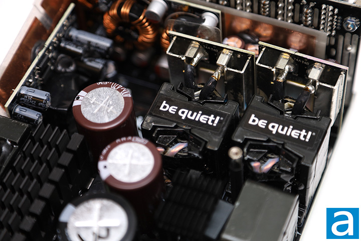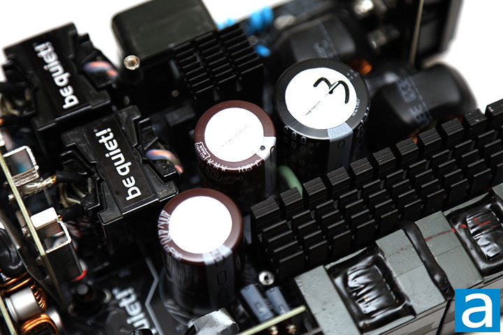 The active PFC circuit featured on the be quiet! Dark Power Pro 13 1300W uses two Vishay General Semiconductor LVB2560 bridge rectifiers on both sides of the largest heatsink. At 115V, the maximum rectified forward current capacity with heatsink is 25A each, so you can theoretically pull up to 5750W (25A * 2 diodes * 115V) from the bridge rectifier at 100% efficiency. Of course, this is limited by the fact that it is not 100% efficient and also neglects the fact that not every component in the system is able to keep up.