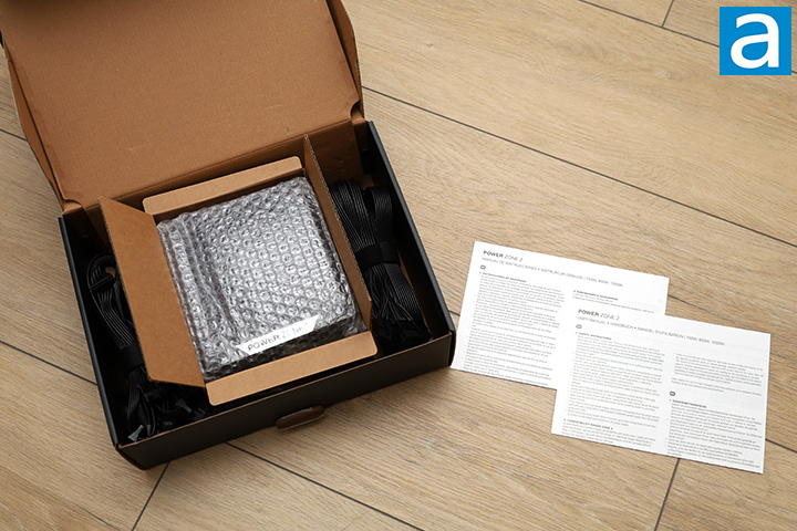 The be quiet! Power Zone 2 750W's retail package can be opened by a flap along the bottom. Upon opening the box, you will find the bundle is reasonable with few extras. What you will get is the be quiet! Power Zone 2 750W itself in the middle inside some bubble wrap, modular cables on both sides, AC power cable, five standard screws, five zip ties, and product manuals in various languages.