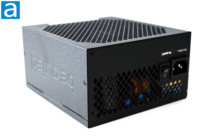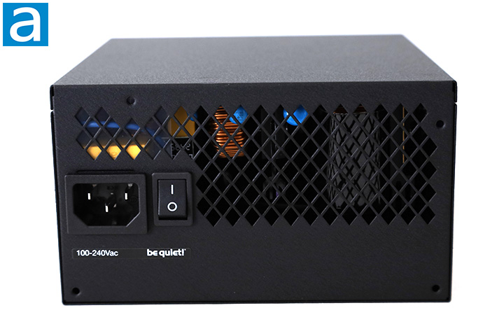 As always, there is a horizontally aligned male connector for power input on the western edge along with an on/off switch next to it. Beneath the two is a sticker with be quiet!'s logo and the input voltage range. The rear ventilation opening could be implemented in a more efficient manner in my opinion, as more than a third of the back is not ventilated. The be quiet! Power Zone 2 750W has automatic full range 100V to 240V AC line voltage selection as with all active PFC power supplies, so the user does not have to worry about manually selecting input voltage.