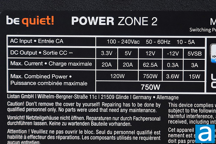 The voltage specification label is located on the side of the be quiet! Power Zone 2 750W. There are two main virtual rails. Up to 20A can be delivered via the +3.3V rail for a total of 66W, while the 20A on the +5V rail brings the output to 100W in this area. The total combined output for the +3.3V and +5V rail is 120W. In other words, your power allocation combination must fall within the limits of the listed specifications. Meanwhile, a single powerful +12V rail delivers up to 62.5A -- 750W -- to maximize power delivery flexibility compared to multiple rails. Overall, the combined power output for the whole be quiet! Power Zone 2 750W is 750W, as its name suggests. It does sound a bit confusing to understand how this works at first, but generally speaking, this configuration allows sufficiently flexible power demands and should be sufficient to accommodate most users. The power outputs in the +3.3V and 5V rails are within the norm, as most PSUs in this wattage range released in the last few years usually have them between 20A and 22A. This is because modern systems do not have a lot of need in this area.