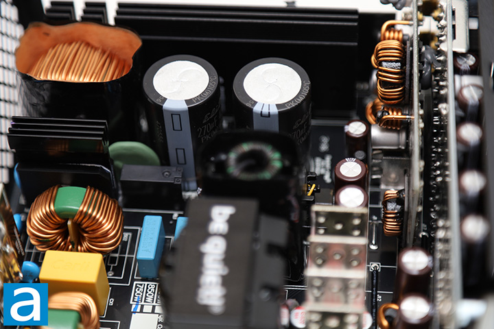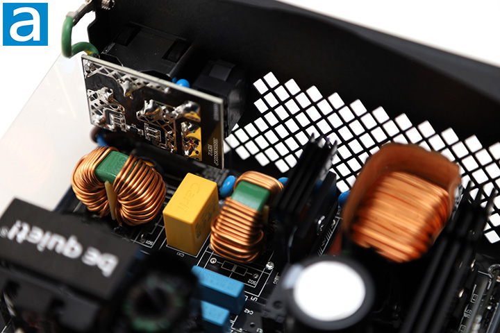 On the primary side, we can see two Taiwanese brand Elite capacitors. Japanese brand capacitors are preferred. Our 750W version of be quiet!'s Power Zone 2 series power supply incorporates two capacitors, both 270µF x 420V, in parallel for a total of 540µF capacitance. They are rated at 105c, whereas more value-oriented power supplies usually use 85c rated capacitors.