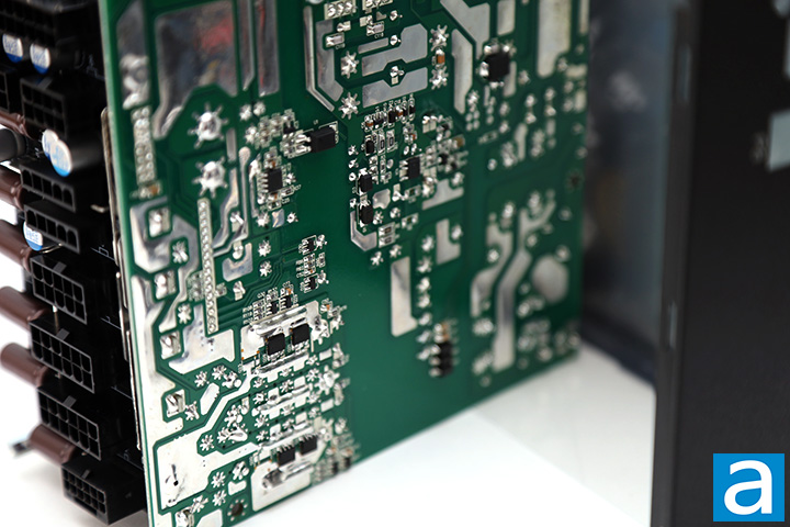 At the very back, we have a large daughterboard covering the entire rear panel for the modular cable sockets. All connection points are soldered directly to the add-on PCB after the secondary stage to reduce power transmission loss compared to having wires. The output connector configuration can be seen on the previous page.