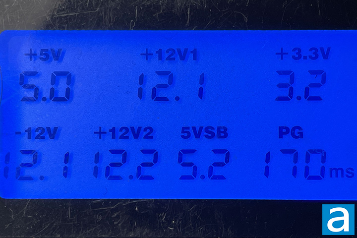 Voltages with minimal load are generally accurate, which is a basic requirement of power supplies out of the box. In this situation all are all within 3%. The PG or Power Good delay is tested at 170ms. This power supply officially supports Alternative Sleep Mode, so it is likely the PSU tester was not fast enough to pick up the true PG signal. The design specifications state it is required to be between 100ms and 500ms, with 250ms maximum for Non-Alternative Sleep Mode and 150ms for Alternative Sleep Mode.