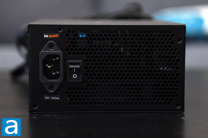 On the back of the power supply, there is a typical honeycomb-style grille. There is also a horizontally aligned male connector for power input on one side of the unit with an on/off switch beside it. We do not have a zero RPM fan mode switch here, but be quiet! says the fan should be quiet enough in everyday loads such that it does not create too much noise when rotating. Otherwise, this ventilation area is important to allow heat to flow out of the back. Most modern power supplies have an automatic full range 110V to 240V AC line voltage selection, so there is no need for a manual switch, as seen on older power supply units without active PFC.