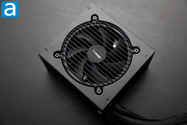 At the top, the fan has metal bars over the intake to prevent cables or fingers from entering this area while allowing air to flow freely here. This grille is secured to the rest of the enclosure with a screw in each corner. The 120mm fan underneath generates airflow by drawing air from the bottom of the power supply over the internal components to keep them cool. Exhaust heat is then pushed out the back of the power supply through the other opening on this power supply. Five screws around the power supply keep the whole unit enclosed with one screw covered by a warranty seal. This means you cannot open the be quiet! Pure Power 12 1000W without voiding its 10-year warranty.