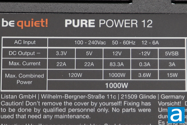 The voltage specification label is located on the outer panel of the be quiet! Pure Power 12 1000W. There are two main virtual rails. Up to 22A can be delivered via the +3.3V rail for a total of 72.6W, while the 22A on the +5V rail brings the output to 110W in this area. The total combined output for the +3.3V and +5V rail is 120W. In other words, your power allocation combination must fall within the limits of the listed specifications. Meanwhile, a single powerful +12V delivers up to 83.3A for a maximum power output of 1000W. This is different from the modular be quiet! Pure Power 12 M 1000W, which used two +12V rails. Overall, the combined power output for the be quiet! Pure Power 12 1000W is an unsurprising 1000W. It does sound a bit confusing to understand how this works at first, but this configuration allows flexible power demands and should be sufficient to accommodate most users. I have seen higher power outputs in the +3.3V and 5V rails for similar rated units, but this is the same as the Pure Power 12 M, and the overall distribution is still reasonable for a 1000W power supply.