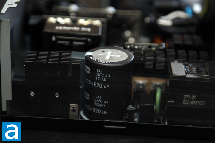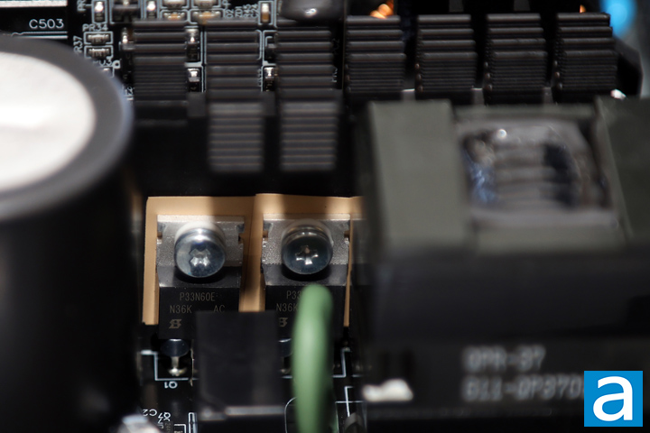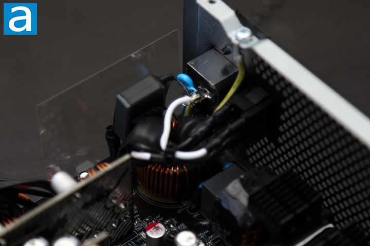 The active PFC circuit featured on the be quiet! Pure Power 12 1000W uses two Yangjie GBJ2510 bridge rectifiers on one side of the large primary heatsink. At 115V, the maximum rectified forward current capacity with heatsink is 25A each, so you can theoretically pull up to 5750W -- 25A * two diodes * 115V -- from the bridge rectifier at 100% efficiency. Of course, this is limited by the fact that it is not 100% efficient, and neglects the fact that not every component in the system is able to keep up.