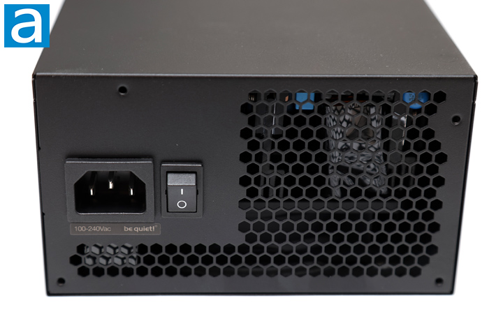 On the back of the power supply, there is a standard honeycomb-style grille. On one side of the unit is a horizontally aligned male C13 power input connector with an on/off switch beside it. We do not have a zero RPM fan mode switch here because it is always enabled. As such, the fan will turn off under low enough loads. Otherwise, this ventilation area is important to allow heat to flow out of the back. Most modern power supplies have an automatic full range 110V to 240V AC line voltage selection, so there is no need for a manual switch, as seen on older power supply units without active PFC.