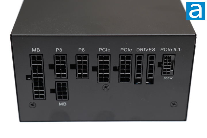 At the rear cable connection panel, everything is clearly labeled and in the correct orientation. Similar connectors are grouped together and laid out in a logical manner. From the left side, there is a motherboard 24-pin split into two plugs. Immediately to the right of that are two 10-pin connectors labeled as P8 for the ATX/EPS 4+4 pin and 8-pin outputs. Next are two 12-pin outputs for the PCI Express connections. Nearby, there are two 5-pin connectors for peripheral headers like SATA and Molex. Finally, we have a 12+4-pin 600W 12V-2x6 PCIe 5.0 plug. One thing I do like is the fact it is quite tricky to accidentally plug the wrong cable into the wrong port, as none of them share the same physical plug as each other. This is a reasonable array of outputs in correspondence to the number of connectors on each modular cable, which should be sufficient for most users.