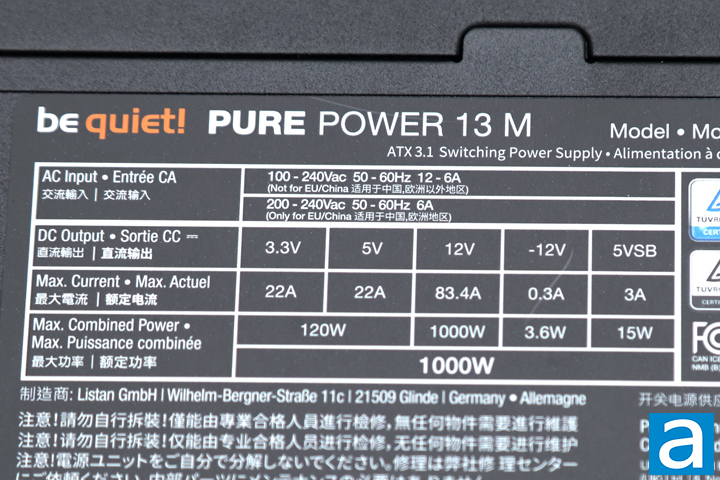 The be quiet! Pure Power 13 M 1000W is 80 Plus Gold and Cybenetics ETA Gold certified on the box, but if you go to the Cybenetics website, they have upgraded the rating to Cybenetics ETA Platinum. The 80 Plus Gold certification means that it is at least 87%, 90%, 87% efficient at 20%, 50%, and 100% load, respectively. Cybenetics ETA Gold means at 115V input, it is certified to be between 87% and 89% overall efficiency, power factor above 0.970, greater than 75% 5VSB efficiency, and less than 0.19W vampire power. Higher certifications available for power supplies of this type include 80 Plus/Cybenetics ETA Platinum, 80 Plus/Cybenetics ETA Titanium, and Cybenetics ETA Diamond at press time.