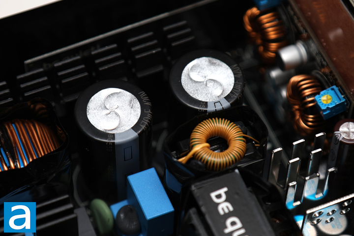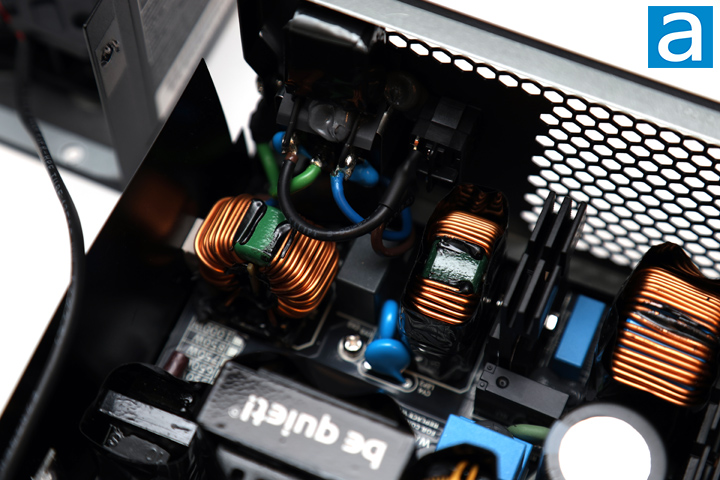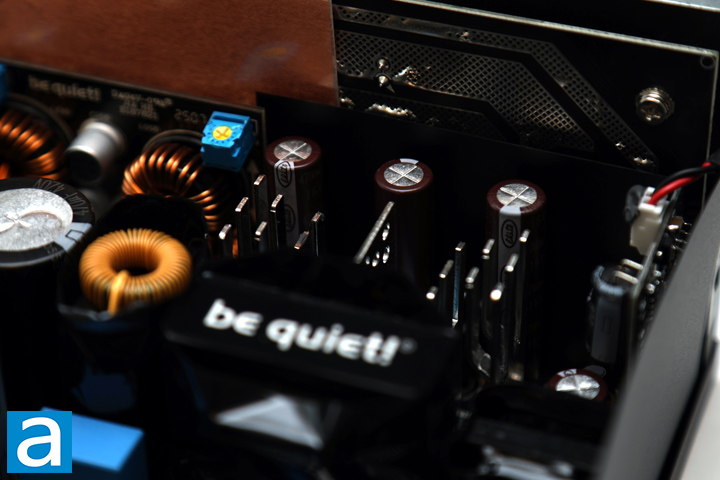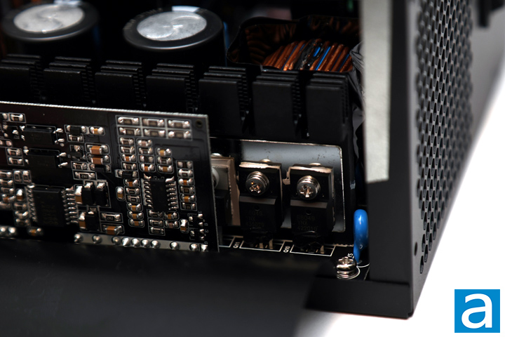 The active PFC circuit featured on the be quiet! Pure Power 13 M 1000W uses two HY Electronic GBJ2508L bridge rectifiers on one side of the large primary heatsink. At 115V, the maximum rectified forward current capacity with heatsink is 25A each, so you can theoretically pull up to 5750W (25A * two diodes * 115V) from the bridge rectifier at 100% efficiency. Of course, this is limited by the fact that it is not 100% efficient and neglects the fact that not every component in the system is able to keep up.