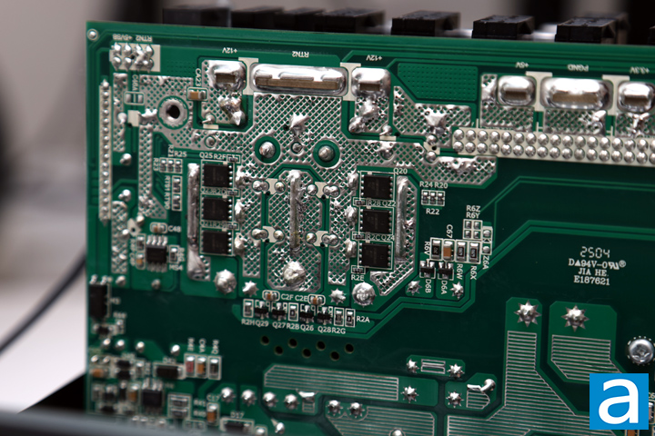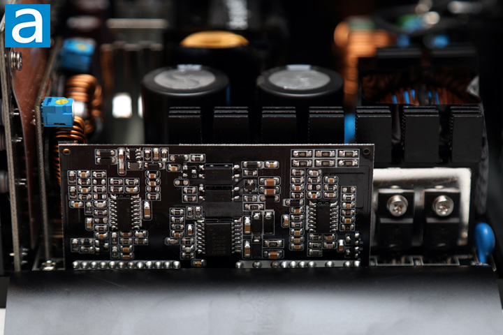 Underneath the main PCB, you will find the rectifiers that produce the +12V out. The +5V and +3.3V outputs are generated from the +12V output using a DC-to-DC converter. Six Champion CMR009N04NS power MOSFETs are responsible for generating the +12V output, located at the bottom of the main PCB. Unfortunately, I was unable to find any specifications on these transistors. More MOSFETs on an add-in board generate the +5V and +3.3V output from the +12V rail, but they were sandwiched between the back modular PCB and a copper heatsink with another thermal pad on top, which made it difficult to see or identify. An IN1S4241-SDG supervisor IC on another add-in board offers overcurrent, overvoltage, undervoltage, short circuit protection, and provide the power good signal. The datasheets for all the components mentioned in the inspection should be found on their respective manufacturers’ website.