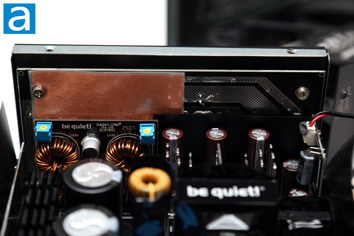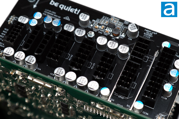 At the back, we have a large daughterboard covering much of the rear panel for the modular cable sockets. All modular sockets at the bottom are soldered directly to the main PCB after the secondary stage. Pin headers join the mainboard and daughterboard to reduce power transmission loss. The output connector configuration can be seen on the previous page. Overall, the internal build quality of the be quiet! Pure Power 13 M 1000W power supply is excellent. Components are arranged very well for optimal cooling with no wires running around inside, and solder points on the PCB are quite clean. It is also notably improved over previous Pure Power units, as there is more space and less crowding of components. The component choices here are not necessarily top tier but they are adequate for a mainstream PSU.