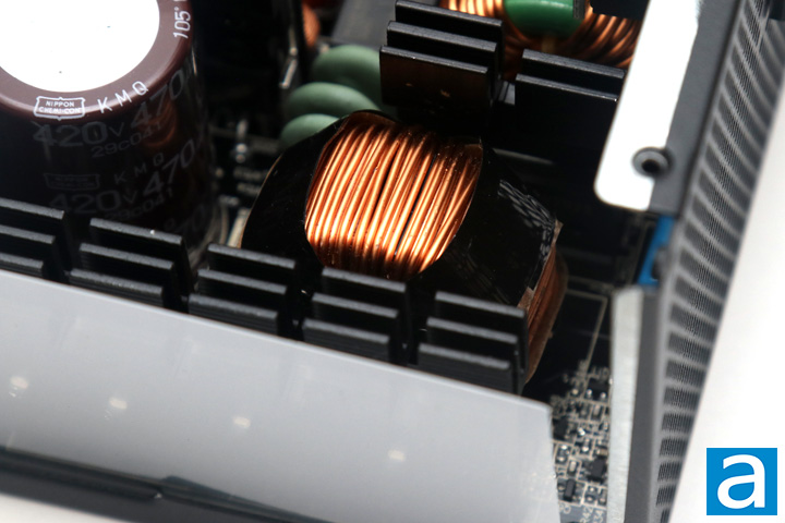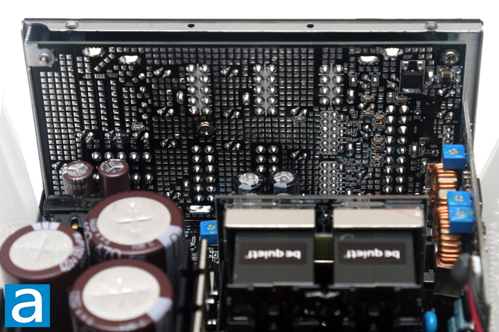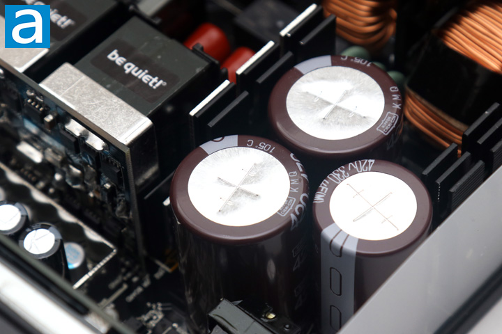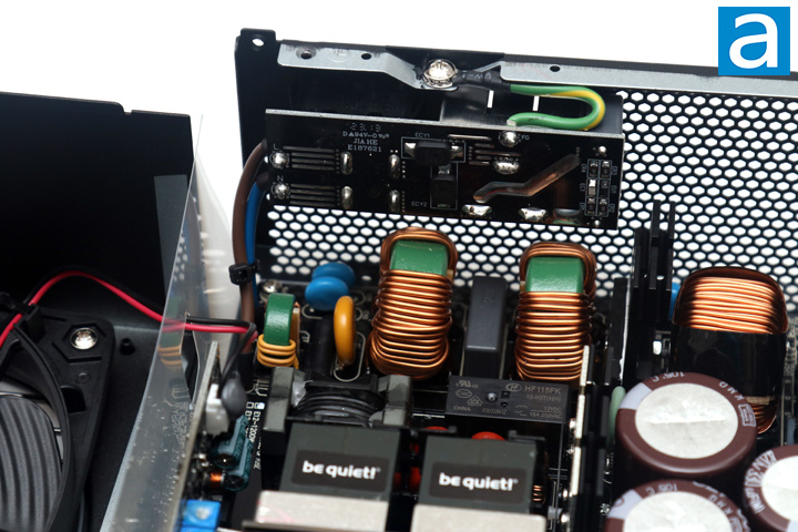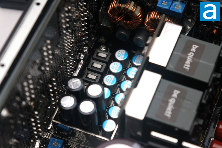 The active PFC circuit featured on the be quiet! Straight Power 12 1200W uses two Shindegen LL25XB60 bridge rectifiers on each side of a heatsink. At 115V, the maximum rectified forward current capacity with heatsink is 25A each, so you can theoretically pull up to 5750W (25A * 2 diodes * 115V) from the bridge rectifier at 100% efficiency. Of course, this is limited by the fact that it is not 100% efficient and also neglects the fact that not every component in the system is able to keep up.