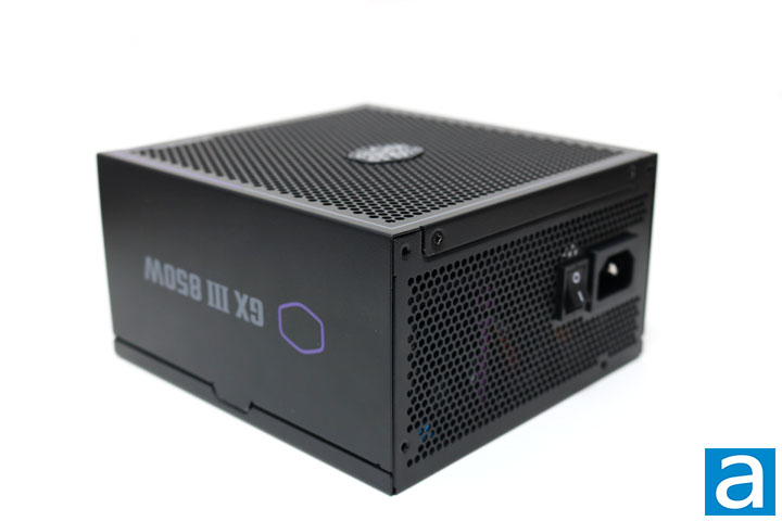 The Cooler Master GX III Gold 850W has a fairly understated and simple design, especially considering previous power supplies from the company we have reviewed like the V850 Gold i multi 850W and XG850 Plus Platinum 850W. The top of the power supply features a honeycomb design for air intake with the fan right behind it. The design is clean with screws mostly hidden along the side of the power supply rather than on the top. The Cooler Master logo is found right in the middle of the honeycomb pattern, while there is a mostly white line running around the perimeter with purple accents at the corner where the name of the power supply can be found. Some other Cooler Master branding can be found on the other side of the product with the white and purple color scheme continued. On the side, the full name with the minimalist Cooler Master logo can be found. Overall, the design is clean and simple, offering a minimalist aesthetic.