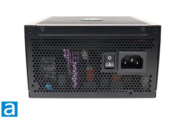 On this side of the power supply, we find the AC power socket and an on/off rocker switch. These two components take up minimal space in the honeycomb mesh, which means air that has pulled in from the bottom has the most room to leave. Providing clean lines of airflow is a valuable part of keeping the power supply cool under heavy loads. The honeycomb mesh also provides a glimpse of the interior of the power supply, allowing one to spot a few of the internal components, particularly a striking purple heatsink.