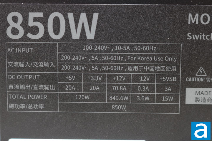 On one side of the power supply, we have a sticker supplying more detailed specifications. As with most power supplies, there are two main virtual rails. Up to 20A can be delivered via the +3.3V rail for a total of 66W, while the 20A on the +5V rail brings the output to 100W in this area. The total combined output for the +3.3V and +5V rail is 120W. In other words, your power allocation combination must fall within the limits of the listed specifications. Meanwhile, a single powerful +12V rail delivers up to 70.8A -- 849.6W -- to maximize power delivery flexibility compared to multiple rails. We have seen higher current allocations at the +3.3V and +5V rails at this power output, including recent units like the be quiet! Dark Power 13 and Thermaltake Toughpower GF3. That said, the power outputs in the +3.3V and 5V rails are within the norm, as most PSUs in this wattage range released in the last few years usually have them between 20A and 22A. This is because modern systems do not have a lot of need in this area.