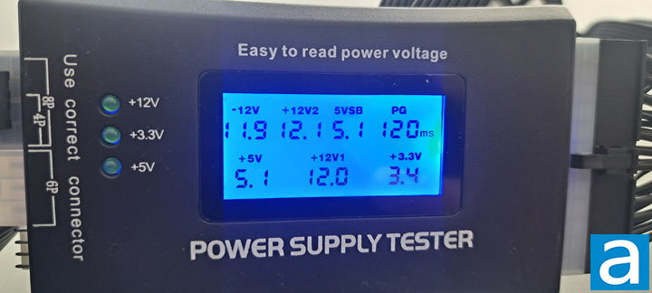 Voltages with minimal load are accurate, which is a basic requirement of power supplies out of the box. This power supply is ATX 3.0 compliant and officially supports Alternative Sleep Mode with 100 to 150ms PG specifications, and this is indicative of the 120ms power good signal from the tester. The ATX design specifications state a PSU's PG is required to be between 100ms and 500ms, with 250ms maximum for Non-Alternative Sleep Mode and 150ms for Alternative Sleep Mode.