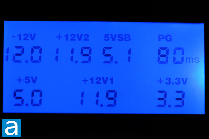 Voltages with minimal load are generally accurate, which is a basic requirement of power supplies out of the box. In this situation all are all within 2%. The PG (Power Good) delay is very good compared to old power supplies, but out of the specification at 80ms. The ATX standard specification states it should be within 100ms to 500ms.