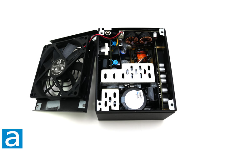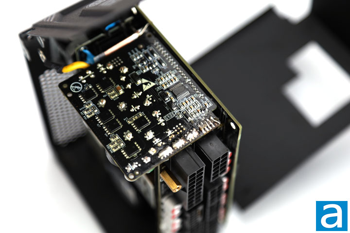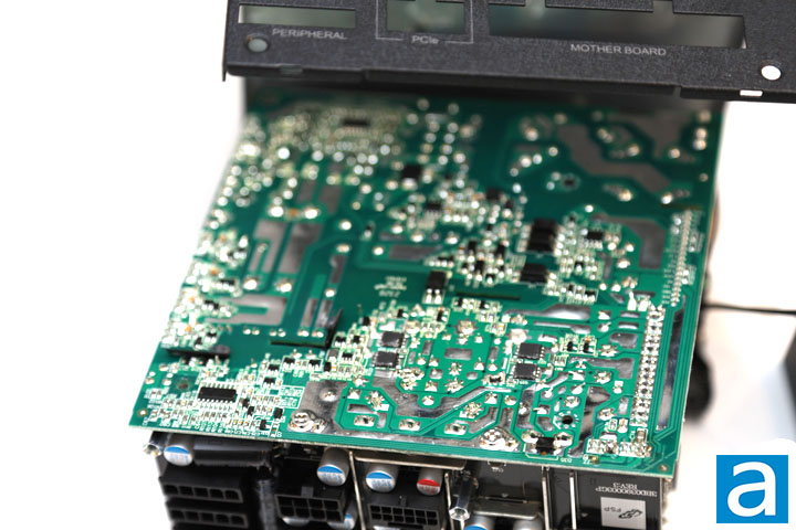 On the secondary side, all rectifiers produce the +12V out, while the +5V and +3.3V outputs are generated from the +12V output using a DC-to-DC converter within as with modern high efficiency power supplies. The +5V and +3.3V output is generated by six InPower Semiconductor IPS 014N04SA MOSFETs on a daughterboard located on the side of the power supply. ANPEC's APW7159C is the PWM switching controller.