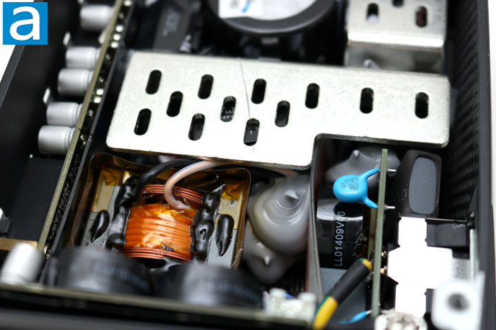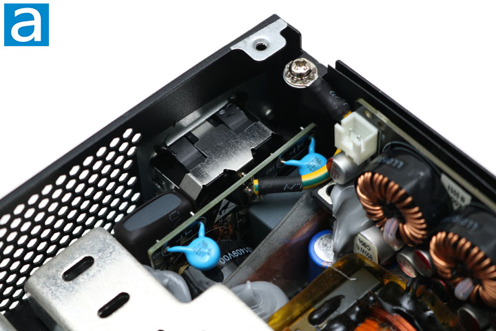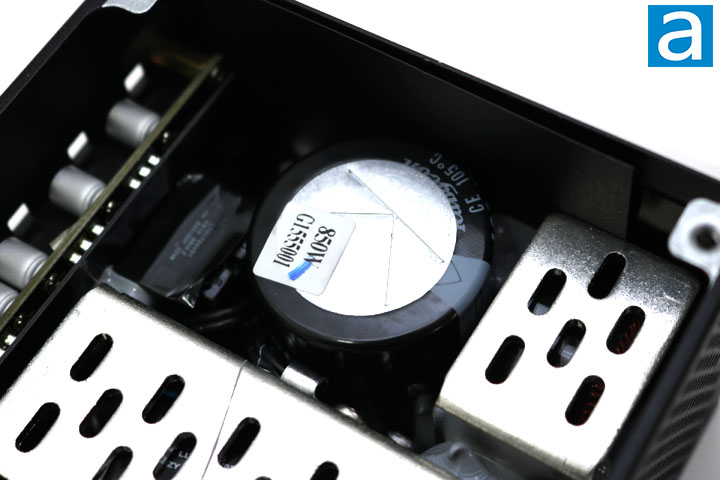 Continued at the primary side, we find a Japanese-branded Rubycon capacitor. Cooler Master claims to have Japanese brand capacitors, so we should not be surprised by this find. The capacitor is rated for 730µF at 420V, rated for 105c. The higher temperature rating is at least one indication of a higher quality capacitor, since more budget friendly PSUs will typically go for 85c rated models.