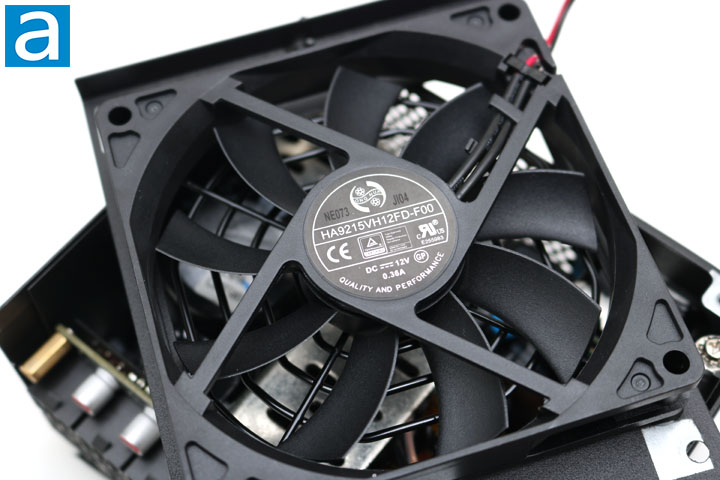As for cooling, a single 92mm, 15mm thick Hong Hua HA9215VH12FD-F00 fan. This uses fluid dynamic bearings, which should mean it can run quietly and for longer periods of time. From the label, you can see this operates at 12V and 0.36A. Otherwise, it is connected with two wires to a daughterboard on the secondary stage of the power supply.