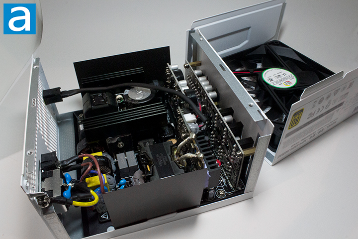 As usual, we proceeded to open up our Cooler Master V650 Gold V2 White Edition 650W so you do not have to. You can access the four screws from the fan side to gain access to the internals of the power supply. One of the screws is covered by a warranty seal, which is quite challenging to remove without tearing. I would highly advise you not to remove this seal as it will void your ten-year warranty. There is no reason to open up your power supply anyway, as there are no user-serviceable parts inside. Once the screws are removed, you are able to slide apart the top and bottom shell to get a good look inside as seen in the image above. The Cooler Master V650 Gold V2 White Edition 650W's OEM is Gospower, who also built the Cooler Master V850 SFX Gold 850W and Cooler Master MWE 650 White V2 650W, both of which my colleague Aaron Lai has reviewed. The main difference between this and the MWE 650 White V2 650W is the V650 Gold V2 White Edition 650W has sightly higher end components, higher efficiency rating, and is fully-modular. The build quality is good with a couple of globs of glue around the insides. The sides are shielded with a plastic shield to prevent shorts from any of the components within. There are two heatsinks, one on each side of the primary capacitor.