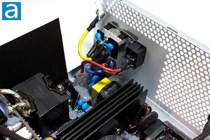 At the back, we have a larger daughterboard covering the majority of the rear panel for the modular cable sockets. All modular sockets at the bottom are soldered directly to the main PCB after the secondary stage to reduce power transmission loss. The output connector configuration can be seen on the previous page. Overall, the internal build quality of the Cooler Master V650 Gold V2 White Edition 650W is average. Components are arranged well for optimal cooling, aside from a wire routed across the board, and the solder points on its PCB are quite clean. However, there are occasional big globs of glue. The V650 Gold V2 White Edition 650W contains generally acceptable components, which are appropriate for its performance class. The datasheets for all components mentioned in this review can be found on their respective manufacturer's websites.