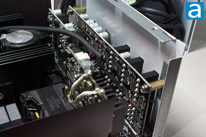 Moving forward, we can see more capacitors rated at 105c. Aside from a couple of Rubycon capacitors, we find many more Nichicon capacitors. I find it strange how these are true high quality Japanese capacitors, but the primary capacitor is not. All rectifiers produce the +12V out, while the +5V and +3.3V outputs are generated from the +12V output using a DC-to-DC converter within as with modern high efficiency power supplies. Two Sanrise SRC60R140BTFE MOSFETs are responsible for generating the +12V output, located on one of the heatsinks. The SRC60R140BTFE’s rated continuous drain current is 11.2A at 125c. It has an RDS(on) value of 0.140 ohm maximum and 0.120 typical at 25c. Six InPower Semiconductor FTD05N03NA MOSFETs provide the +5V and +3.3V outputs, located on the daughterboard. The FTD05N03NA’s rated continuous drain current is 75A at 100c. It has an RDS(on) value of 0.006 ohm maximum and 0.004 typical at 25c. An ANPEC APW7159C is installed at the bottom of the daughter card as the PWM controller.