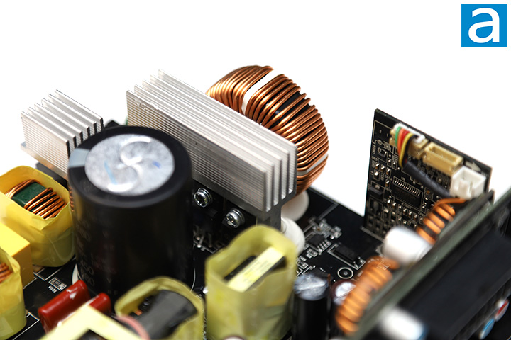 The active PFC circuit featured on the Cooler Master V850 Gold i multi 850W uses two Taiwan Semiconductor GBU15L05 bridge rectifiers attached to opposite sides of the first heatsink. At 115V, the maximum rectified forward current capacity with heatsink is 15A each, so you can theoretically pull up to 3450W (15A * 2 diodes * 115V) from the bridge rectifier at 100% efficiency. Of course, this is limited by the fact that it is not 100% efficient and also neglects the fact that not every component in the system is able to keep up.