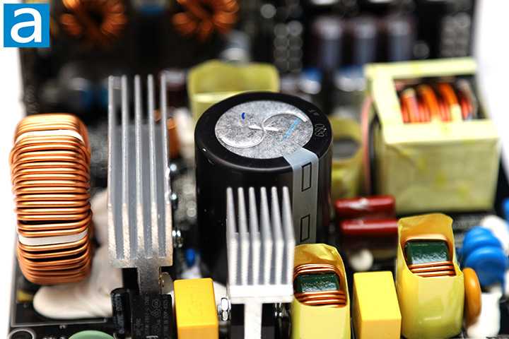 On the primary side, we can see one Japanese brand Toshin Kogyo capacitor. 100% Japanese brand capacitors are specified on the marketing material, so this is to be expected. Our 850W version of Cooler Master's latest V-series power supply incorporates one 680µF x 450V capacitor. It is rated at 105c, whereas more value-oriented power supplies usually use 85c rated capacitors.