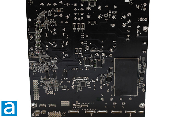 At the back, we have a large daughterboard covering the majority of the rear panel for the modular cable sockets. All modular sockets at the bottom are soldered directly to the main PCB after the secondary stage. Pin headers join the mainboard and daughterboard to reduce power transmission loss. The output connector configuration can be seen on the previous page.