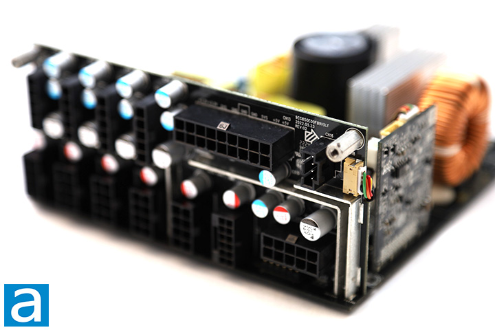 Four Alpha & Omega AON6144 MOSFETs are responsible for generating the +5V and +3.3V outputs, located on the vertical board parallel to the rear connector board. The AON6144's rated continuous drain current is 89A at 100c. It has an RDS(on) value of 2.4 mΩ maximum and 2.0 mΩ typical. An ANPEC APW7159 synchronous buck PWM controller can be seen on the same board as well.