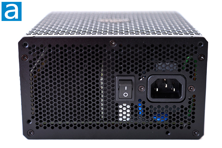 Starting from the back part of the power supply, we have the same familiar honeycomb mesh design as most PSUs on the market today. What you will find here is a horizontally aligned male connector for power input on the eastern edge and an on/off switch. The reason why the power connector is on the eastern edge rather than the western edge is because the Cooler Master X Silent Edge Platinum 850W is designed to be installed with the ventilation facing up, which is the opposite of units with a bottom-mounted fan.