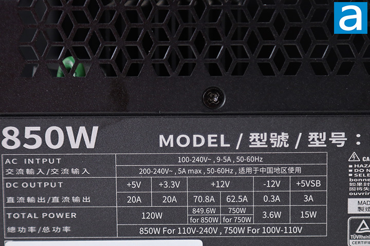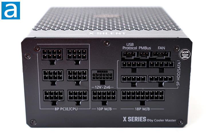 The voltage specification label is located on one of the side panels of the X Silent Edge Platinum 850W. There are two main virtual rails. Up to 20A can be delivered via the +3.3V rail for a total of 66W, while the 20A on the +5V rail brings the output to 100W in this area. The total combined output for the +3.3V and +5V rail is 120W. In other words, your power allocation combination must fall within the limits of the listed specifications. Meanwhile, a single powerful +12V rail delivers up to 40.8A -- 849.6W -- to maximize power delivery flexibility compared to multiple rails. Overall, the combined power output for the whole Cooler Master X Silent Edge Platinum 850W is 850W, as its name suggests. It does sound a bit confusing to understand how this works at first, but generally speaking, this configuration allows sufficiently flexible power demands and should be sufficient to accommodate most users. The power outputs in the +3.3V and 5V rails are appropriate for its wattage class. The power outputs in the +3.3V and 5V rails are within the norm, as most PSUs in this wattage range released in the last few years usually have them between 20A and 22A. This is because modern systems do not have a lot of need in this area.