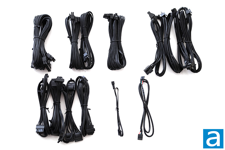 A total of twelve black colored modular power cables are included out of the box. All modular cables are coated and are easy to bend, making them extremely easy to work with. The wires are not labeled, but from a visual inspection, it looks like the high current PCI Express, motherboard, and ATX/EPS connectors are 16 AWG with the rest 18 AWG. Manufacturers often will fatten high current cables to 16 AWG, so this is common practice.