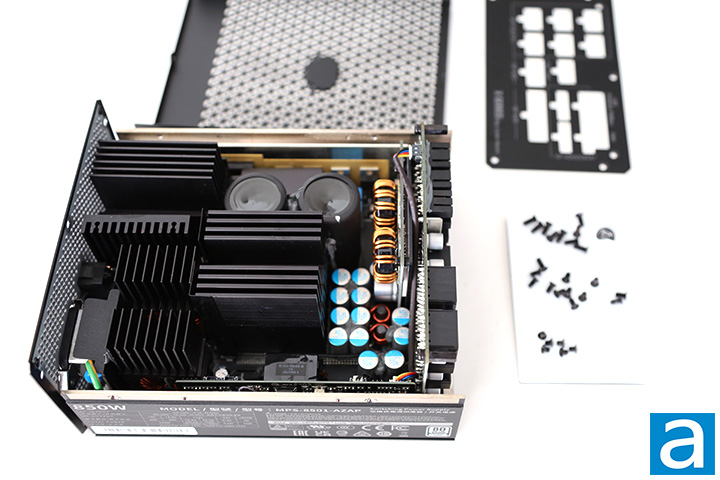 Opening the Cooler Master X Silent Edge Platinum 850W is quite straightforward with the removal of ten screws. Taking out the internal components from the enclosure requires the removal of more. Our photo above shows an overhead view of its internal components. Its OEM is Cooler Master themselves, which is impressive, considering how hard it is to do so. It features an LLC full bridge topology with bridgeless interleave PFC on the primary side and DC-to-DC converters on the secondary side. At first glance, the build quality appears to be excellent. There are six main heatsinks inside and almost no wires. Five of the six are finned and painted black, and they are all are of various sizes, as you can see in our photo above.