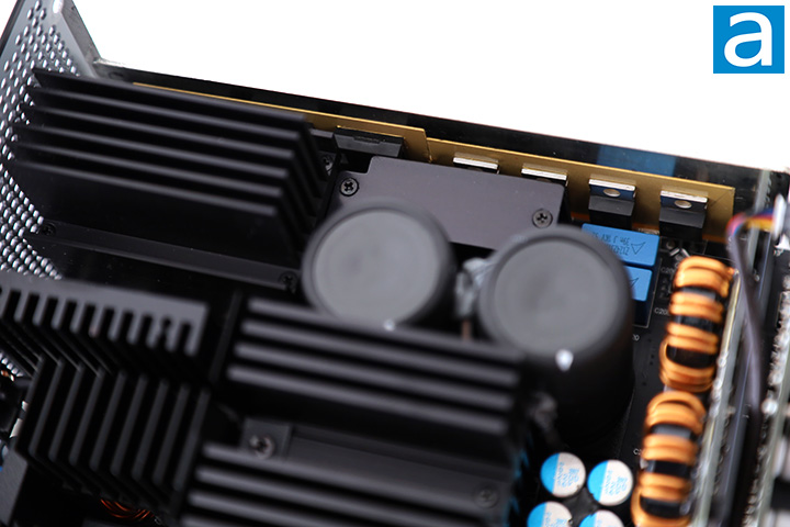 The active PFC circuit featured on the Cooler Master X Silent Edge Platinum 850W is a bridgeless full bridge design. On the middle heatsink near the rear edge, a vertical PCB is spotted with a Nexperia TEA2208T full wave active bridge rectifier controller. Four Infineon IPT60R022S7 rectifier MOSFETs are used. Each is certified for up to 23A at 140c. These transistors present a maximum resistance of 20 mΩ and typical resistance of 22 mΩ at 25c when turned on according to the manufacturer's data sheet. This on characteristic is called Static Drain-Source On-Resistance, or commonly abbreviated as RDS(on). The more efficient the component is, the lower the RDS(on) value, since it wastes less power with lower resistance.