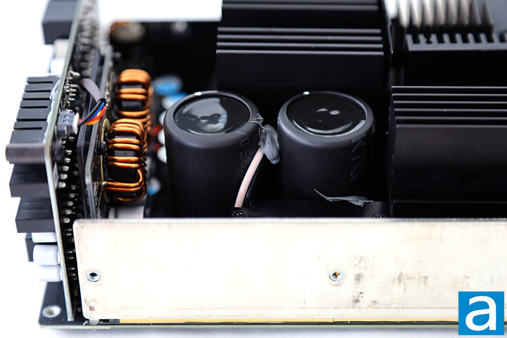 On the primary side, we can see two Japanese brand TDK capacitors. Our 850W version of Cooler Master's latest X Silent Edge Platinum series power supply incorporates two 560µF x 450V capacitors in parallel for an equivalent capacitance of 1120µF x 450V. It is rated at 105c, whereas more value-oriented power supplies usually use 85c rated capacitors.