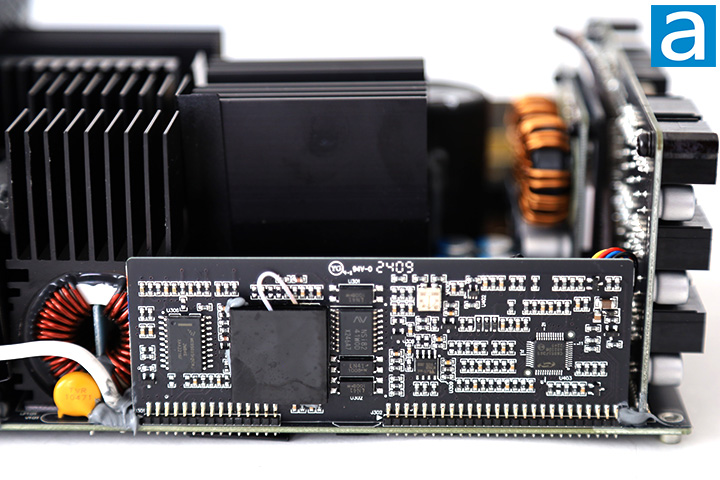 More components can be found on another daughterboard, perpendicular to the rear modular cable sockets panel, shown in the photo above. On the left, we can see the NXP MC9S08SH8CWJ, which is the MCU for the primary side. The Silicon Labs C8051F380-GQ, on the right, is the MCU for the secondary side. The X Silent Edge Platinum still features analog controllers for the circuits, so it looks like these components are used for temperature monitoring, current load, and efficiency data and feeding them into MasterCTRL software only. Meanwhile, a Weltrend WT7502R monitoring IC provides overvoltage, undervoltage, short circuit protection, and power good signal generation.
