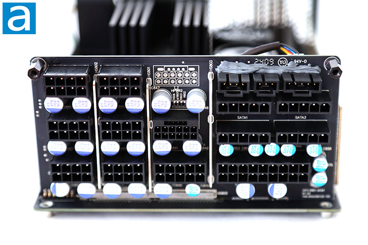 At the back, we have a large daughterboard covering the majority of the rear panel for the modular cable sockets. All modular sockets at the bottom are soldered directly to the main PCB after the secondary stage. Pin headers join the mainboard and daughterboard to reduce power transmission loss. The output connector configuration can be seen on the previous page. Since this is a passively cooler power supply, there is no fan inside.
